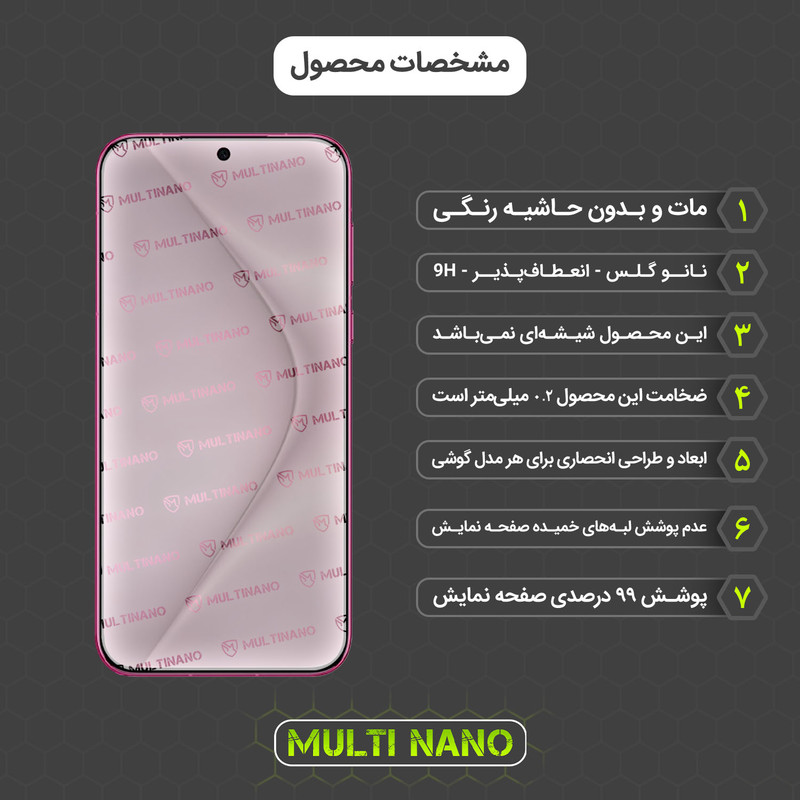 محافظ صفحه نمایش مات مولتی نانو هواوی Pura 70 یکی از بهترین انتخابها برای حفظ ایمنی و زیبایی گوشی شماست. این گلس با طراحی بدون حاشیه مشکی، دید کاملی از صفحه نمایش را فراهم میکند و به شما این امکان را میدهد که از تمام فضای صفحه به بهترین نحو استفاده کنید. همچنین به دلیل نبود حاشیه مشکی، از اختلال در کارکرد سنسورها جلوگیری میکند. مواد تشکیل دهنده این محافظ (مواد سیلیکونی، نانو و مقداری شیشه) با استفاده از تکنولوژی نانو به صورت فشرده با ضخامت کم، ساخته شده که باعث دفع ضربه و جلوگیری از آسیب به صفحه نمایش میشود.