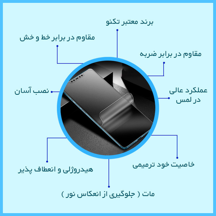ویژگیها: جلوگیری از انعکاس نور , قابلیت نصب آسان , مقاوم در برابر چربی و اثرانگشت , مقاوم در برابر خط و خش