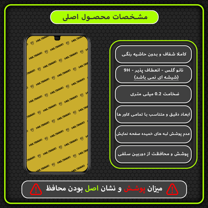 محافظ صفحه نمایش انعطاف پذیر نانو Multi Nano ، گلسی با ساختار شفاف و بدون حاشیه رنگی که توسط فناوری نانو ساخته شده و از ضخامت 0.2 میلی متری برخوردار است.محافظ صفحه نمایش مولتی نانو, نسل جدید محافظ های صفحه نمایش گوشی که از تکنولوژی نانو در ساخت آن استفاده شده است (شیشه ای نمی باشد) و باعث مقاومت بسیار بیشتر در برابر ضربه نسبت به گلس های معمولی شده است همچنین کاملا نشکن است و در صورت برخورد ضربه نخواهد شکست بسیار شفاف است و به مرور زمان کدر نخواهد شد و لمس آن با توجه به ساختار تکنولوژی روغنی بسیار آسان و روان است. از جمله محافظ صفحه نمایش های معمول در بازار میتوان محافظ بوف و محافظ شیشه ای گلس را نام برد که استفاده کنندگان از این محافظ ها نارضایتی هایی از جمله سیاه و کدر شدن و لغزنده نبودن محافظ بوف و شکسته شدن محافظ گلس دارند. محافظ صفحه نمایش مولتی نانو (مناسب گوشی موبایل Huawei Nova 3i) عیب های این دو محافظ را نداشته و یک انتخاب تازه و معقول برای محافظت از صفحه نمایش در برابر ضربات احتمالی میباشد.ضربه پذیری این محافظ با توجه به این که ضخامت بسیار کمتری نسبت به محافظ شیشه ای (گلس) دارد به مراتب از ضربه پذیری آن از محافظ شیشه ای بیشتر است و از صفحه نمایش گوشی موبایل (هوآوی نوا 3 آی) شما در برابر شکستگی , خط و خش و... محافظت میکند.محافظ صفحه نمایش نانو مولتی نانو قسمت های خمیده (curved) صفحه گوشی را پوشش نمیدهد اما برای گوشی هایی که خمیدگی ندارند، صفحه نمایش را به خوبی پوشش میدهد.همچنین این محصول سازگاری کامل با تمامی بک کاور های موجود در بازار را دارد به این دلیل که تنها حدود 90 درصد صفحه نمایش را در بر می گیرد توجه داشته باشید که این محصول دارای برچسب اول (قبل از نصب) و برچسب دوم (بعد از نصب) می باشد و رنگ اصلی محصول کاملا، بدون حاشیه رنگی و شفاف می باشد. در اغلب گوشی های موبایل که سنسور ها و لنز دوربین سلفی در صفحه نمایش به کار گرفته میشوندxxبه دلیل محافظت هر چه بیشتر و بهتر از صفحه نمایش گوشی و حتی آسیب های احتمالی ، ضربه و خش روی دوربین سلفی، این محافظ قسمت دوربین سلفی را نیز پوشش می دهد که هیچگونه عملکرد منفی در کارکرد آن ندارد.xx