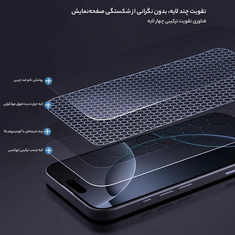 ویژگیها: 9H , قابلیت نصب آسان , مقاوم در برابر چربی و اثرانگشت , مقاوم در برابر خط و خش , نصب بدون حباب