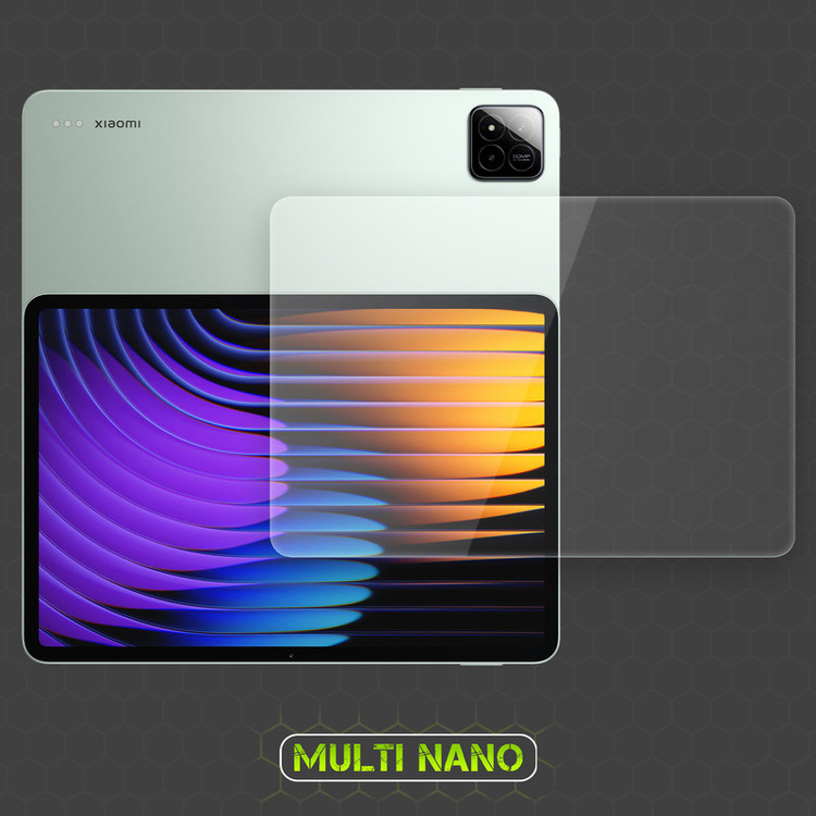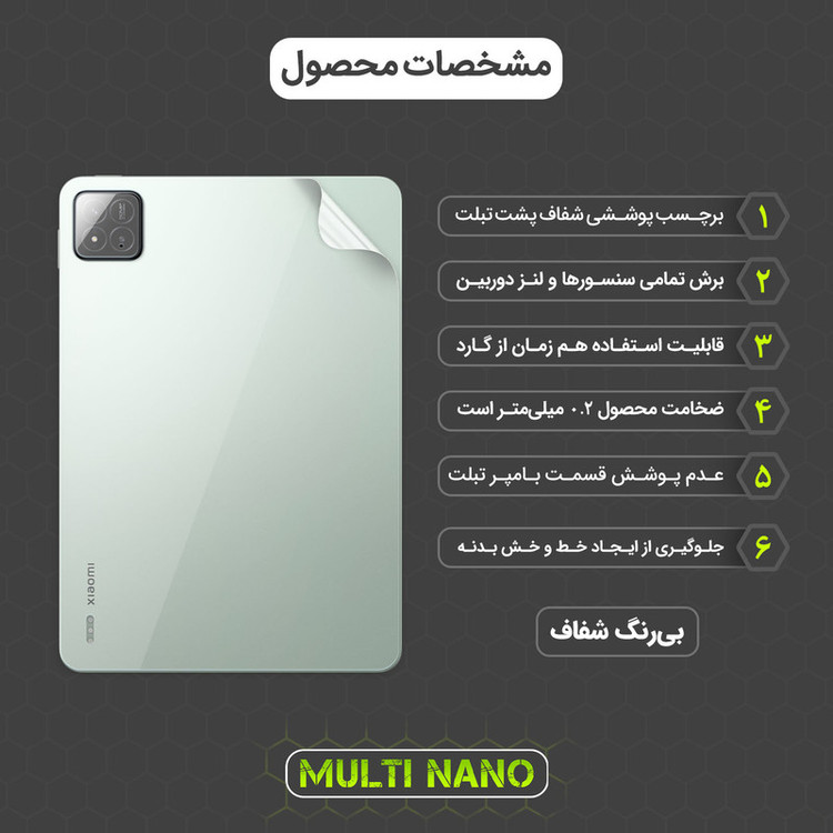 محافظ صفحه نمایش مولتی نانو MULTINANO محافظی کاملاً شفاف و بدون حاشیه رنگی است که از ضخامت 0.2 میلیمتری برخوردار است. این محافظ که در دسته گلس تبلت قرار میگیرد، از متریال نانو ساخته شده (شیشهای نمیباشد) که در برابر ضربه و خط و خش از تبلت شما محافظت میکند. این نوع محافظ که با تکنولوژی Nano Glass تولید شده، علاوه بر انعطافپذیری بالا، عملکردی مشابه گلسهای شیشهای دارد با این تفاوت که سبکتر و مقاومتر است.محافظ صفحه نمایش (تبلت Xiaomi Pad 7) بسیار شفاف است و به مرور زمان کدر نمیشود، به همین دلیل کیفیت صفحه نمایش تبلت شما همیشه در حالت اولیه قرار دارد. طراحی این گلس به صورت فول اسکرین بوده و تمام سطح نمایشگر را بدون هیچ حاشیهای پوشش میدهد. پوشش دوربین سلفی از دیگر ویژگیهای این محافظ میباشد تا دغدغه شما را برای تمیز کردن لنز دوربین از بین ببرد.نقطه قوت محافظ صفحه نمایش (تبلت شیائومی پد 7) این است که به صورت اختصاصی برای تبلت شما طراحی شده است و نمونه مشابه دیگری ندارد.در کنار این، محافظ پشت شفاف مولتی نانو MULTINANO نیز عرضه شده که ظاهری براق به تبلت شما میدهد. این محافظ پشت ضخامت کمی دارد تا ظرافت تبلت شما حفظ شود و همچنین از پشت تبلت در برابر خط و خش محافظت میکند. گرد و غبارهایی که بین کاور و بدنه تبلت قرار میگیرند، به مرور زمان باعث ایجاد خط و خشهایی روی بدنه تبلت شما میشوند. محافظ پشت (تبلت شیائومی Pad 7) بهترین راهحل برای مقابله با این خط و خشهاست.