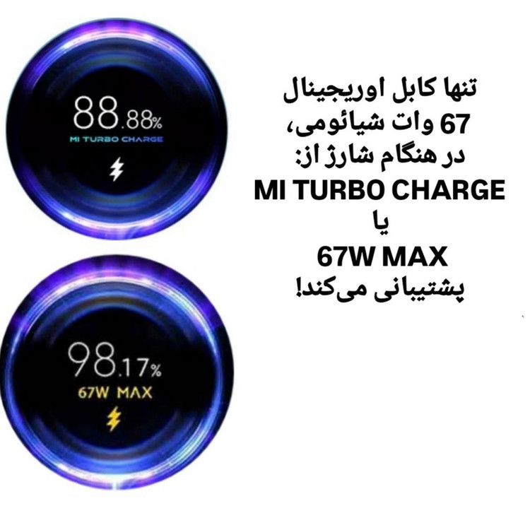کابل 67 وات اوریجینال برند شیائومی، با پشتیبانی از درصد ریز شمار با خروجی 6 آمپر و توان 67 وات Turbo ، و همچنین سازگار با انواع مدل های پایین تر چون ؛ 33 وات ، 22.5 وات یکی از بهترین گزینه ها برای خرید کابل است. این کابل با تمامی شارژر ها سازگار است و تا توان خروجی 67 وات را پشتیبانی می کند. همچنین توانایی انتقال دیتا با سرعت 1 گیگابایت بر ثانیه را نیز دارد. جنس این کابل از TPE است و این ماندگار کابل را بسیار بالا خواهد برد.
