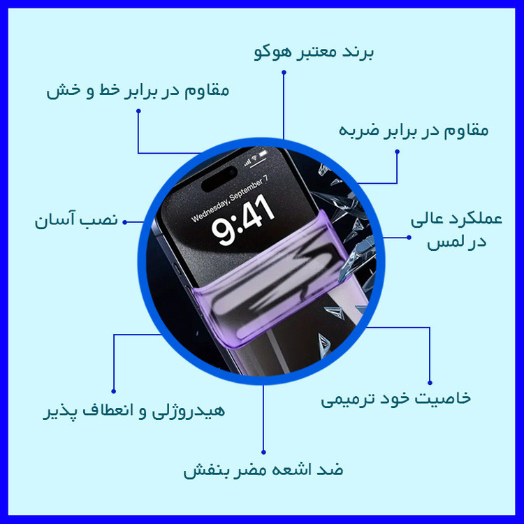ویژگیها: جلوگیری از انعکاس نور , قابلیت نصب آسان , مقاوم در برابر چربی و اثرانگشت , مقاوم در برابر خط و خش
