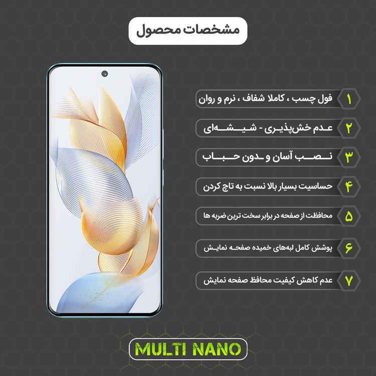- شفافیت بالا - لمس نرم و روان - حساسیت بالا - پوشش کامل صفحه نمایش و لبه های خمیده - سازگار با حسگر اثر انگشت زیر نمایشگر - گلس شیشه ای و تمام چسب