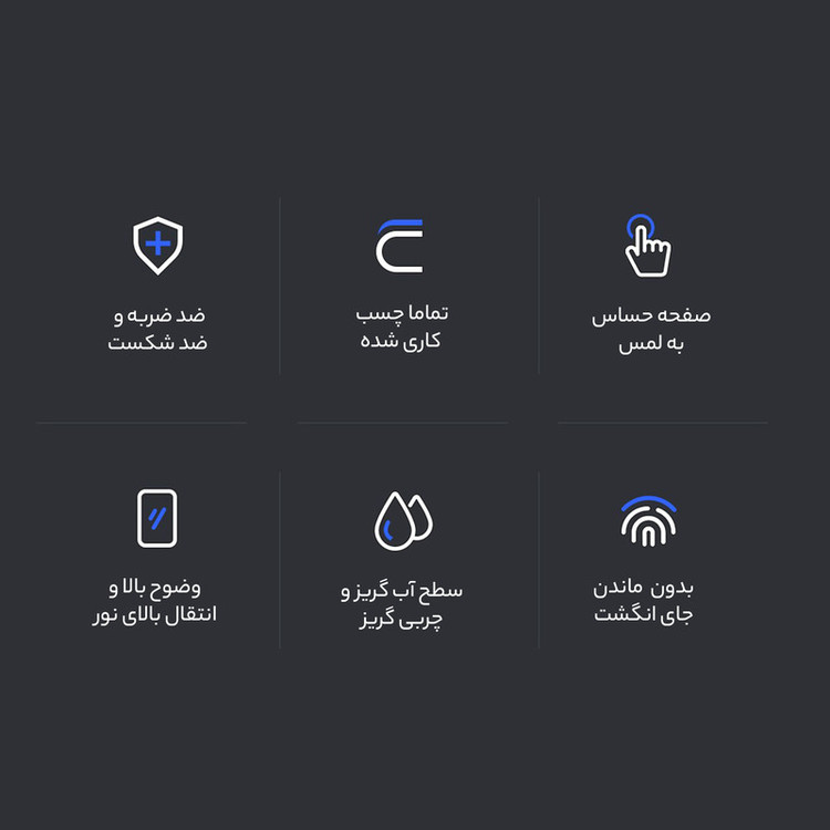 9H , جلوگیری از انعکاس نور , قابلیت نصب آسان , مقاوم در برابر چربی و اثرانگشت , مقاوم در برابر خط و خش , نصب بدون حباب
