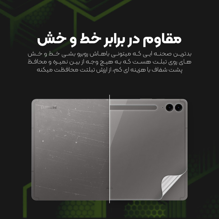 اگر میخواهید ظاهر لوکس و طراحی چشمنواز تبلت سامسونگ Galaxy Tab S10 Ultra X920 / X926 14.6 inch 2024 شما بهوضوح دیده شود و در عین حال از آسیبهای احتمالی در امان بماند، محافظ پشت شفاف هیدروژل مولتی نانو مدل X-F1T انتخابی هوشمندانه و حرفهای است. این محصول از متریال PPF (هیدروژلی خودترمیمشونده) ساخته شده و با ضخامت بسیار کم (حدود ۰.۲ میلیمتر)، بدون افزودن وزن یا تغییر در فرم ظاهری دستگاه، از بخش پشتی بدنه در برابر خط و خش ناشی از سایش، گرد و غبار و تماسهای روزمره محافظت میکند. طراحی آن بهگونهای است که لبههای دستگاه را نمیپوشاند، در نتیجه میتوانید بهراحتی از انواع کاورها و کیبوردهای مغناطیسی نیز استفاده کنید. برخلاف تصور رایج که گارد بهتنهایی کافی است، گرد و غبار جمعشده بین قاب و بدنه میتواند به مرور زمان به بدنه آسیب بزند، از اینرو استفاده از محافظ شفاف ضدخش، نهتنها در حفظ ظاهر آیپد مؤثر است بلکه ارزش آن را نیز حفظ میکند. این محافظ با نصب آسان، چسبندگی بالا، خاصیت خودترمیمی و شفافیت بینقص، گزینهای ایدهآل برای کاربرانیست که به دنبال محافظتی مطمئن و نامحسوس برای دستگاه خود هستند.