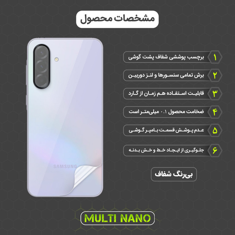 محافظ پشت گوشی مولتی نانو برای موبایل سامسونگ Galaxy A36 بهترین گزینه برای جلوگیری از خط و خشهای ناشی از گرد و غباری است که به تدریج بین کاور و بدنه گوشی جمع میشود. محافظ پشت مولتی نانو برای گوشی موبایل سامسونگ Galaxy A36 به گونهای طراحی شده که از پشت موبایل شما در برابر خط و خش، گرد و غبار و لکهها محافظت میکند و در عین حال ضخامت کمی دارد تا ظرافت گوشی شما حفظ شود. یکی از مهمترین مزایای این محافظ، سبکی آن است. برخلاف قابهای سنگین، این محافظ هیچ حجمی به گوشی شما اضافه نمیکند و در عین حال حفاظت مناسبی ارائه میدهد. این ویژگی به شما این امکان را میدهد تا به صورت همزمان از گارد و کیف مورد نظرتان استفاده کنید. رنگ این محافظ بیرنگ و شفاف است که برای افرادی که دوست دارند علاوه بر محافظت، رنگ گوشی خود را حفظ کنند، انتخاب بسیار مناسبی محسوب میشود. این ویژگی باعث میشود گوشی شما همیشه ظاهری تازه و زیبا داشته باشد. محافظ پشت موبایل سامسونگ Galaxy A36 در بستهبندی شکیل و جذاب عرضه میشود که به حفظ کیفیت آن کمک میکند. همچنین به همراه محافظ، لوازم نصب ارائه میشود تا نصب آن برای شما آسان و روان باشد.
