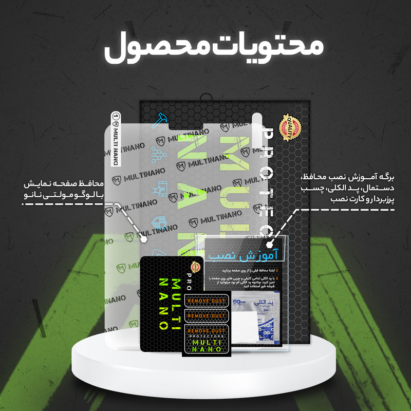 شامل یک عدد محافظ صفحه نمایش مات - پد الکلی - برچسب پرز بردار - دستمال مناسب برای تمیز کردن گوشی - کارت نصب - آموزش نصب