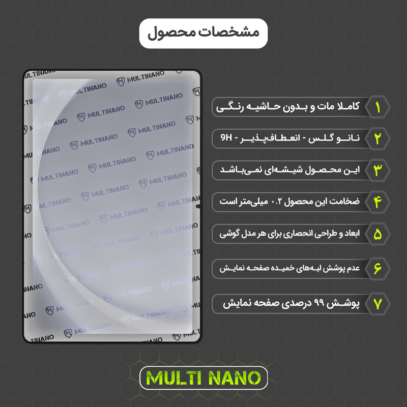 محافظ صفحه نمایش مات Multi Nano، به طور اختصاصی طراحی شده تا از صفحه نمایش تبلت سامسونگ Galaxy Tab A9 Plus شما در برابر خطرات احتمالی به بهترین شکل محافظت کند. مواد تشکیل دهنده این محافظ (مواد سیلیکونی، نانو و مقداری شیشه) با استفاده از تکنولوژی نانو به صورت فشرده ساخته شده که باعث دفع ضربه و جلوگیری از آسیب به صفحه نمایش میشود. این محافظ با ساختار مات و بدون حاشیه رنگی، ضخامت 0.2 میلیمتر و فناوری نانو، مقاومت بسیار بالایی در برابر ضربه دارد و کاملاً نشکن است. طراحی مات آن سبب میشود که ضد چربی و ضد اثر انگشت باشد، بنابراین صفحه نمایش شما همیشه تمیز و واضح باقی میماند. این محافظ بدون حاشیه مشکی است، به طوری که پوشش کاملی از صفحه نمایش را فراهم کرده و از اختلال در کارکرد سنسورها جلوگیری میکند. همچنین، برش دقیق اطراف دوربین سلفی به گونهای انجام شده که هیچ تداخلی در عملکرد دوربین یا سنسورهای مجاور ایجاد نکند. همچنین، با استفاده از این محافظ، تجربه بهتری از عملکرد قلم تبلت خود خواهید داشت. لوازم نصب با بستهبندی متناسب و جذاب، حس لوکس و خاصی را در هر بار استفاده از این محصول به کاربران هدیه میدهد.