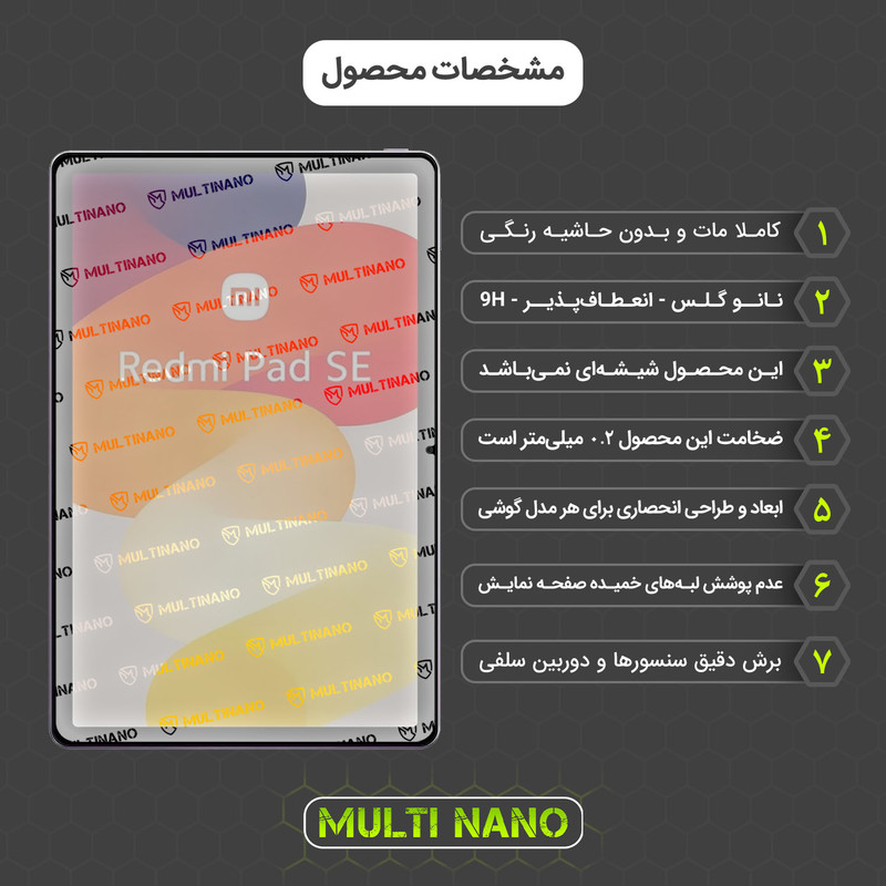 محافظ صفحه نمایش مات Multi Nano، به طور اختصاصی طراحی شده تا از صفحه نمایش تبلت (شیائومی Xiaomi Redmi Pad SE) شما در برابر خطرات احتمالی به بهترین شکل محافظت کند. مواد تشکیل دهنده این محافظ (مواد سیلیکونی، نانو و مقداری شیشه) با استفاده از تکنولوژی نانو به صورت فشرده ساخته شده که باعث دفع ضربه و جلوگیری از آسیب به صفحه نمایش میشود. این محافظ با ساختار مات و بدون حاشیه رنگی، ضخامت 0.2 میلیمتر و فناوری نانو، مقاومت بسیار بالایی در برابر ضربه دارد و کاملاً نشکن است. طراحی مات آن سبب میشود که ضد چربی و ضد اثر انگشت باشد، بنابراین صفحه نمایش شما همیشه تمیز و واضح باقی میماند. این محافظ بدون حاشیه مشکی است، به طوری که پوشش کاملی از صفحه نمایش را فراهم کرده و از اختلال در کارکرد سنسورها جلوگیری میکند. همچنین، برش دقیق اطراف دوربین سلفی به گونهای انجام شده که هیچ تداخلی در عملکرد دوربین یا سنسورهای مجاور ایجاد نکند. همچنین، با استفاده از این محافظ، تجربه بهتری از عملکرد قلم تبلت خود خواهید داشت. لوازم نصب با بستهبندی متناسب و جذاب، حس لوکس و خاصی را در هر بار استفاده از این محصول به کاربران هدیه میدهد.