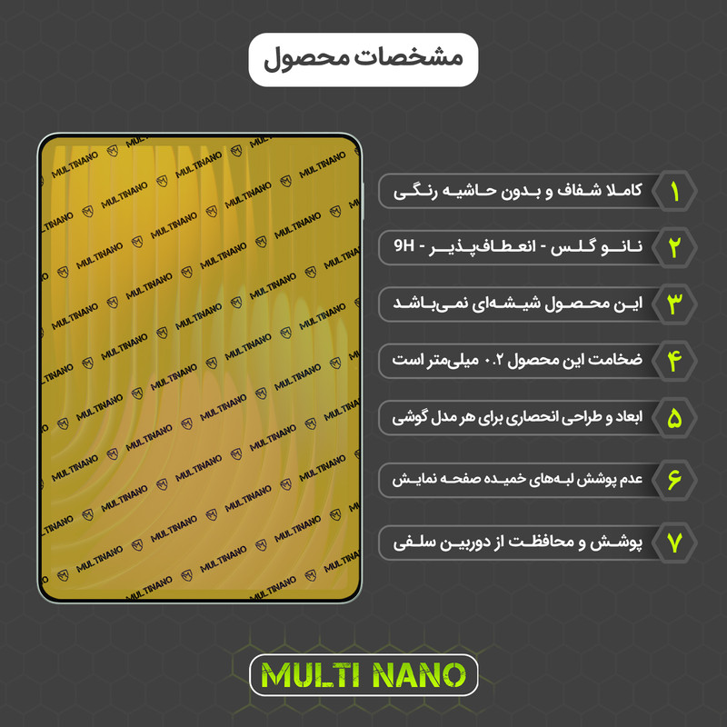 محافظ صفحه نمایش مولتی نانو MULTINANO محافظی کاملاً شفاف و بدون حاشیه رنگی است که از ضخامت 0.2 میلیمتری برخوردار است. این محافظ که در دسته گلس تبلت قرار میگیرد، از متریال نانو ساخته شده (شیشهای نمیباشد) که در برابر ضربه و خط و خش از تبلت شما محافظت میکند. این نوع محافظ که با تکنولوژی Nano Glass تولید شده، علاوه بر انعطافپذیری بالا، عملکردی مشابه گلسهای شیشهای دارد با این تفاوت که سبکتر و مقاومتر است.محافظ صفحه نمایش (تبلت Xiaomi Pad 7 Pro) بسیار شفاف است و به مرور زمان کدر نمیشود، به همین دلیل کیفیت صفحه نمایش تبلت شما همیشه در حالت اولیه قرار دارد. طراحی این گلس به صورت فول اسکرین بوده و تمام سطح نمایشگر را بدون هیچ حاشیهای پوشش میدهد. پوشش دوربین سلفی از دیگر ویژگیهای این محافظ میباشد تا دغدغه شما را برای تمیز کردن لنز دوربین از بین ببرد.نقطه قوت محافظ صفحه نمایش (تبلت شیائومی پد 7 پرو ) این است که به صورت اختصاصی برای تبلت شما طراحی شده است و نمونه مشابه دیگری ندارد.در کنار این، محافظ پشت شفاف مولتی نانو MULTINANO نیز عرضه شده که ظاهری براق به تبلت شما میدهد. این محافظ پشت ضخامت کمی دارد تا ظرافت تبلت شما حفظ شود و همچنین از پشت تبلت در برابر خط و خش محافظت میکند. گرد و غبارهایی که بین کاور و بدنه تبلت قرار میگیرند، به مرور زمان باعث ایجاد خط و خشهایی روی بدنه تبلت شما میشوند. محافظ پشت (تبلت شیائومی Pad 7 پرو) بهترین راهحل برای مقابله با این خط و خشهاست.
