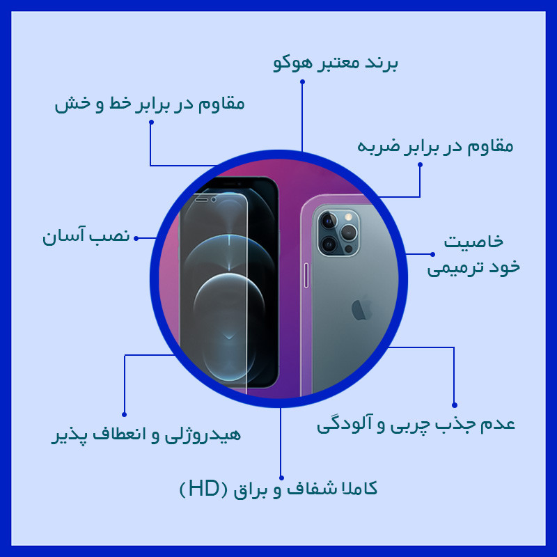 این محافظ کاملا شفاف بوده و به خوبی از صفحه نمایش و بدنه (قاب اصلی پشت) دستگاه در برابر خط و خش و ضربه محافظت میکند. خودترمیم بودن، نصب آسان، یکدست و بدون حاشیه رنگی، برند معتبر هوکو و کیفیت بالا از ویژگی های این محافظ هیدروژلی میباشد و هیچگونه خللی در عملکرد و سرعت تاچ ایجاد نمیکند. همچنین ضخامت بسیار کمی دارد و مزاحمتی برای استفاده همزمان از قاب و کاور ایجاد نمیکند. قبل از نصب کلیپ آموزشی را در اینترنت مشاهده فرمایید.