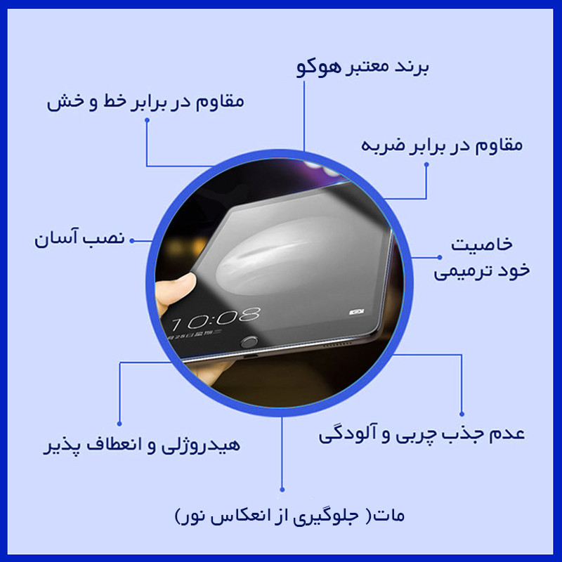 ویژگی‌ها : جلوگیری از انعکاس نور , قابلیت نصب آسان , مقاوم در برابر چربی و اثرانگشت , مقاوم در برابر خط و خش