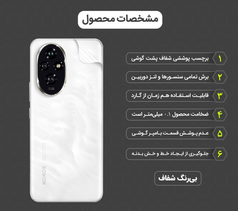 افرادی که نمی خواهند روی بدنه گوشی آنها هیچ گونه خط و خشی ایجاد شود می توانند از برچسب های پشت گوشی نانو استفاده نمایند.این نوع محافظ ضخامت بسیار کم و انعطاف پذیری بالایی دارد که بدنه پشت گوشی شما، حتی لبه های منحنی پشت گوشی را به طور کامل پوشش می دهد و از چسبندگی بالایی برخوردار است. با میزان شفافیت بالایی که دارد در ظاهر و رنگ گوشی شما تغییری ایجاد نمی کند. بنابراین اگر شفافیت ، ظرافت و جلوگیری از ایجاد خط و خش بدنه گوشی برایتان اهمیت دارد؛ برچسب های نانو پشت، گزینه بسیار مناسبی برای خرید هستند. قسمت سفید محصول فقط بک برد و دور ریز میباشد.