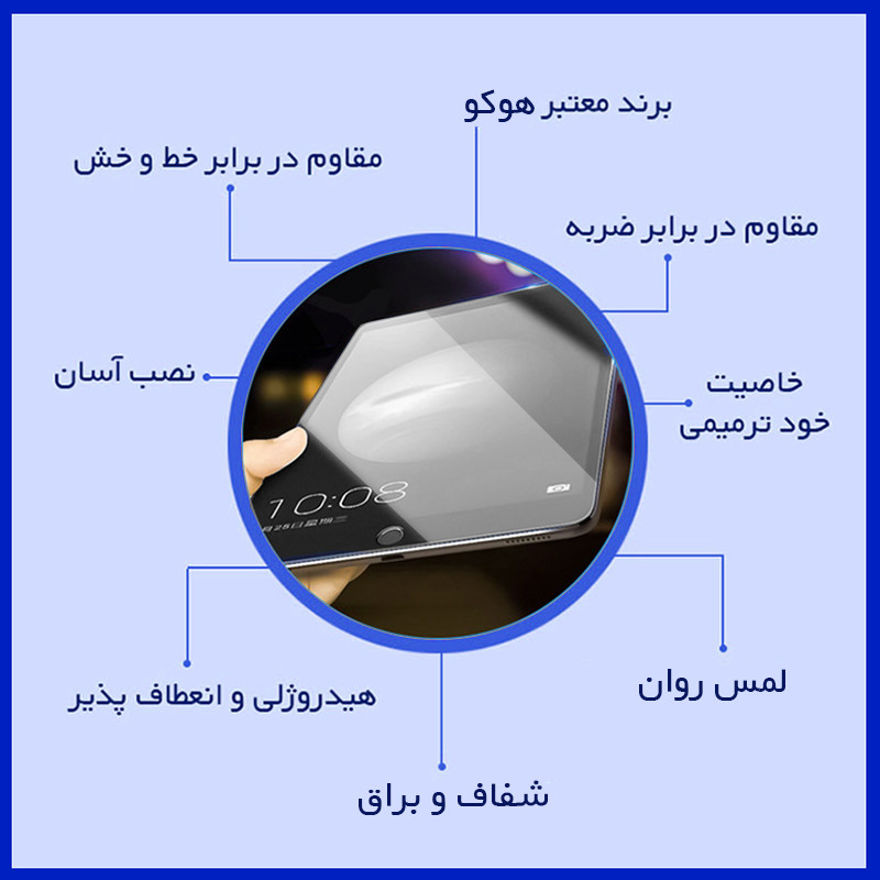 سایر مشخصات: برند معتبر هوکو – یکدست و بدون حاشیه رنگی - خودترمیم - تشخیص سریع اثر انگشت - سرعت تاچ بالا - نصب آسان - کیفیت بالا - کاملا شفاف - قبل از نصب کلیپ آموزشی را در اینترنت مشاهده فرمایید.