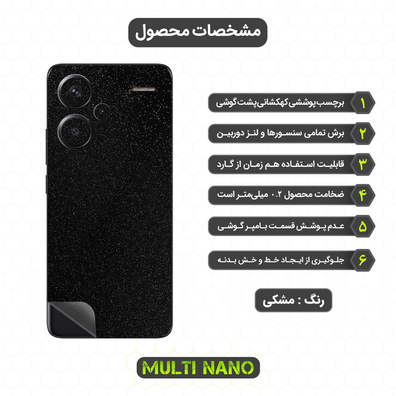 برچسب پوششی طرح کهکشانی Multi Nano به منظور محافظت در برابر خط و خش و ایجاد طرح و رنگی نو برای پشت گوشی موبایل شما طراحی و تولید شده است. به مرور زمان گرد و غبارهایی که بین گارد و پشت گوشی قرار میگیرند، خط و خشهایی روی بدنه ایجاد میکنند که باعث کاهش زیبایی و همچنین کاهش ارزش گوشی شما میشود. پیشنهاد میشود در کنار کاور های شفاف یا دور رنگی موجود در بازار، از برچسب پوششی کهکشانی مولتی نانو استفاده کنید تا گوشی شما در برابر آسیب های احتمالی در امان باشد. جنس این برچسب به گونهای است که ثبات رنگ دارد و رنگ آن به مرور زمان تغییر نمیکند، همچنین این محصول خاصیت ضد لک و ضد اثر انگشت دارد، که تجربه بهتری برای شما رقم میزند. این برچسب به منظور پوشش پشت بدنه و قسمت دوربین گوشی (موبایل Xiaomi Redmi Note 13 Pro Plus) طراحی و تولید شده است و اطراف گوشی را پوشش نمیدهد. ضخامت این برچسب 0.2 میلیمتر می باشد، که از ظرافت گوشی شما کم نمیکند و ظاهری جذاب و متفاوت به گوشی (موبایل شیائومی ردمی نوت 13 پرو پلاس) میدهد.