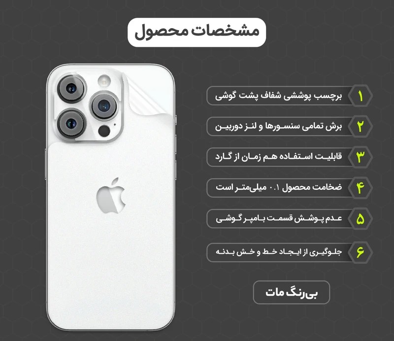 شامل یک عدد برچسب پوششی بی رنگ مات - پد الکلی - برچسب پرز بردار - دستمال مناسب برای تمیز کردن گوشی - کارت نصب - آموزش نصب ویدئویی