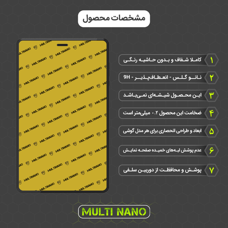 محافظ صفحه نمایش نانو Multi Nano ، گلسی باساختار شفاف و بدون حاشیه رنگی که توسط فناوری نانو ساخته شده و از ضخامت 0.2 میلی متری برخوردار است.(شیشه ای نمی باشد) و باعث مقاومت بسیار بیشتر در برابر ضربه نسبت به گلس های معمولی شده است همچنین کاملا نشکن است و در صورت برخورد ضربه نخواهد شکست بسیار شفاف است و به مرور زمان کدر نخواهد شد و لمس آن با توجه به ساختار تکنولوژی روغنی بسیار آسان و روان است و از صفحه نمایش تبلت (جی ال ایکس اف 8 لایت ) شما در برابر شکستگی , خط و خش و... محافظت میکند.محافظ صفحه نمایش نانو مولتی نانو قسمت های خمیده (curved) صفحه تبلت را پوشش نمیدهد اما برای تبلت هایی که خمیدگی ندارند، صفحه نمایش را به خوبی پوشش میدهد.همچنین قسمت دوربین سلفی برای محافظت هرچه بهتر از صفحه نمایش و نظافت راحت تر پوشش داده شده و تداخلی در عملکرد دوربین یا سنسورهای مجاور ندارد و برای تبلت هایی که اثر انگشت آن روی صفحه نمایش تعبیه شده بسیار مناسب می باشد. همچنین با این محافظ تجربه بهتری از عملکرد قلم تبلت خود خواهید داشت.
