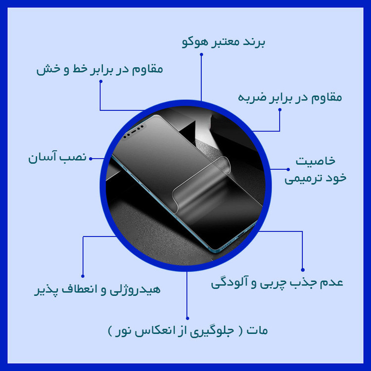 ویژگیها: قابلیت نصب آسان , مقاوم در برابر چربی و اثرانگشت , مقاوم در برابر خط و خش , جلوگیری از انعکاس نور , جلوگیری از ایجاد خط و خش