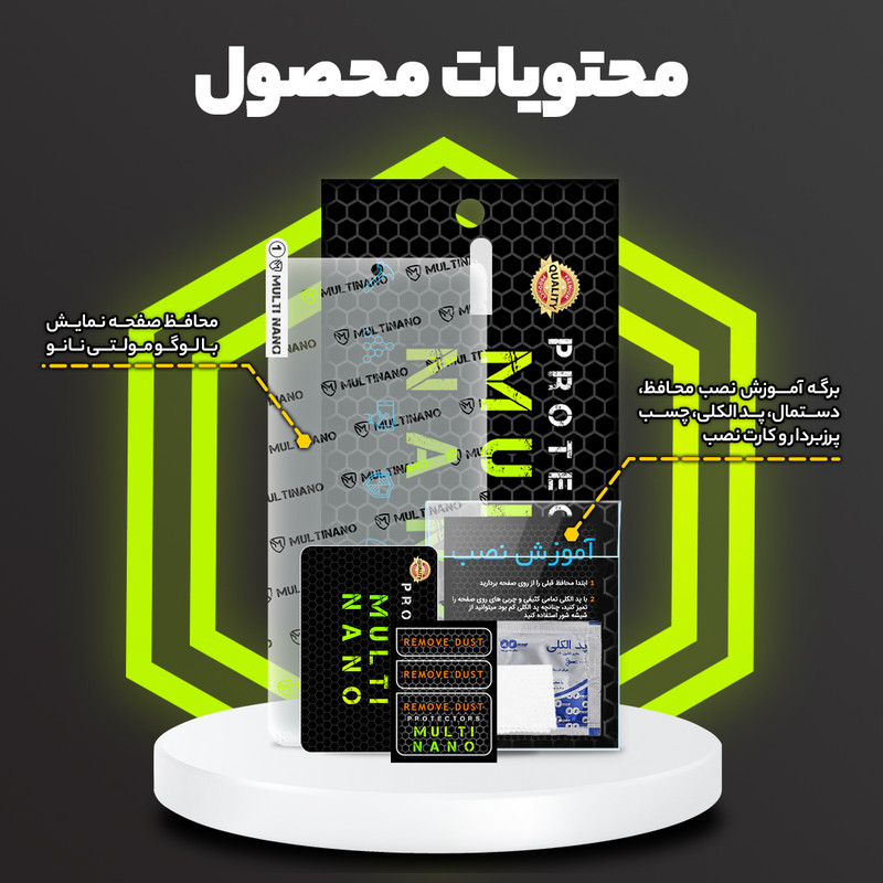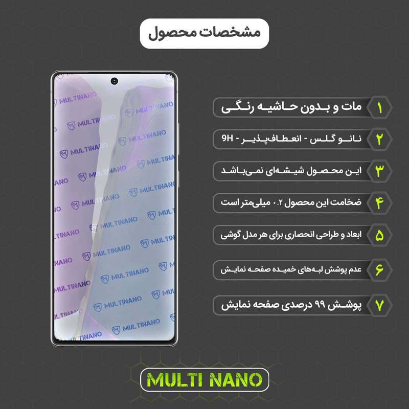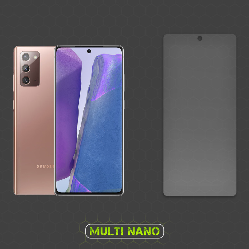 محافظ صفحه نمایش نانو Multi Nano ، گلسی باساختار مات و بدون حاشیه رنگی که توسط فناوری نانو ساخته شده و از ضخامت 0.2 میلی متری برخوردار است.(شیشه ای و تلق نمی باشد) و بخاطر نانو بودن باعث مقاومت بسیار بیشتر در برابر ضربه نسبت به گلس های معمولی است، همچنین کاملا نشکن است و در صورت برخورد ضربه نخواهد شکست. مات بودن این گلس باعث میشود تا نور روی صفحه پخش شود. از صفحه نمایش گوشی موبایل (سامسونگ گلکسی نوت 20) در برابر ضربات احتمالی , خط و خش و... محافظت میکند. محافظ صفحه نمایش مات نانو مولتی نانو قسمت های خمیده (curved) صفحه گوشی را پوشش نمیدهد اما برای گوشی هایی که خمیدگی ندارند، صفحه نمایش را به خوبی پوشش میدهد. با توجه به ضخامت کم این محصول نسبت به گلس های 3 میل، برای گوشی هایی که حسگر اثر انگشت آن روی صفحه نمایش تعبیه شده اند، نیز پیشنهاد میشود.
